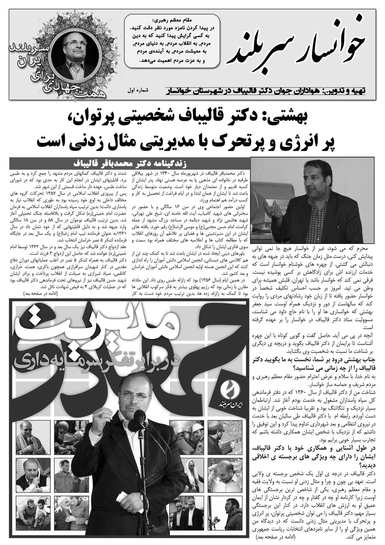 به همت هواداران جوان دکتر قالیباف در خوانسار، اولین ویژه نامه ستاد با عنوان خوانسار سربلند تهیه و تدوین شد.